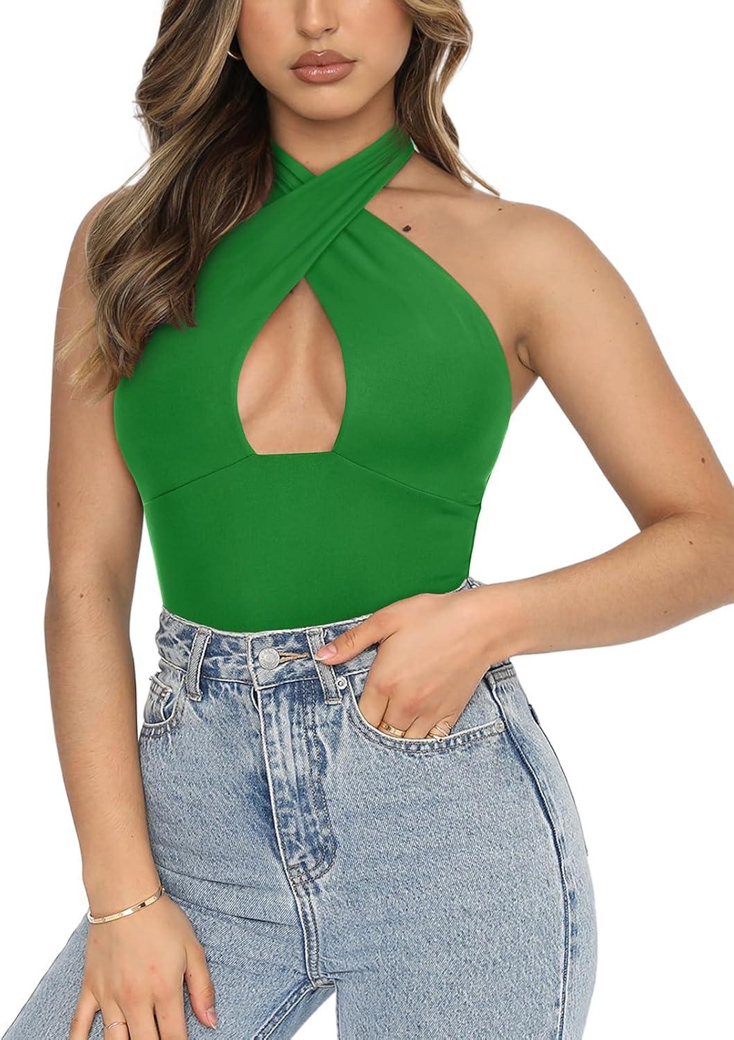 REORIA Butsmooth® Women's Trendy Sexy Casual V Neck Double Lined Sleeveless Slimming Going Out Tank Top Bodysuits(Green)