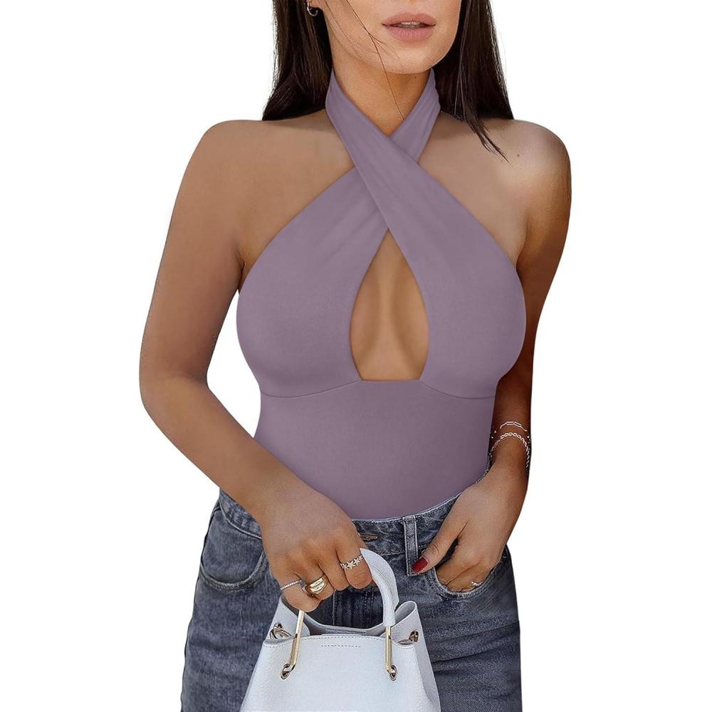 REORIA Butsmooth® Women's Trendy Sexy Casual V Neck Double Lined Sleeveless Slimming Going Out Tank Top Bodysuits(Hazy Lilac)
