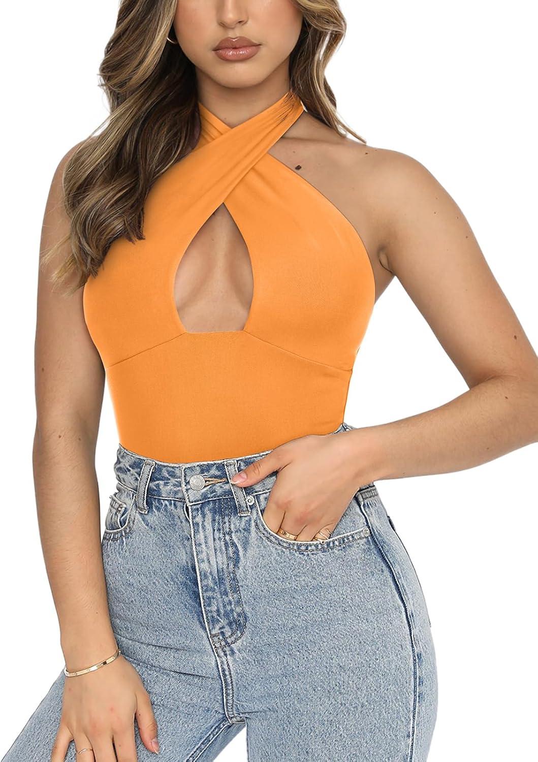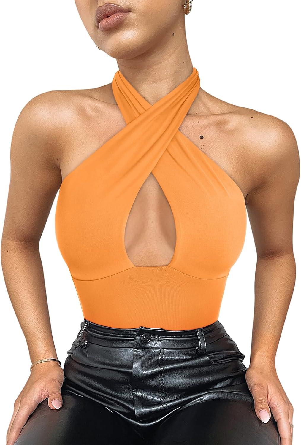 REORIA Butsmooth® Women's Trendy Sexy Casual V Neck Double Lined Sleeveless Slimming Going Out Tank Top Bodysuits(Orange)