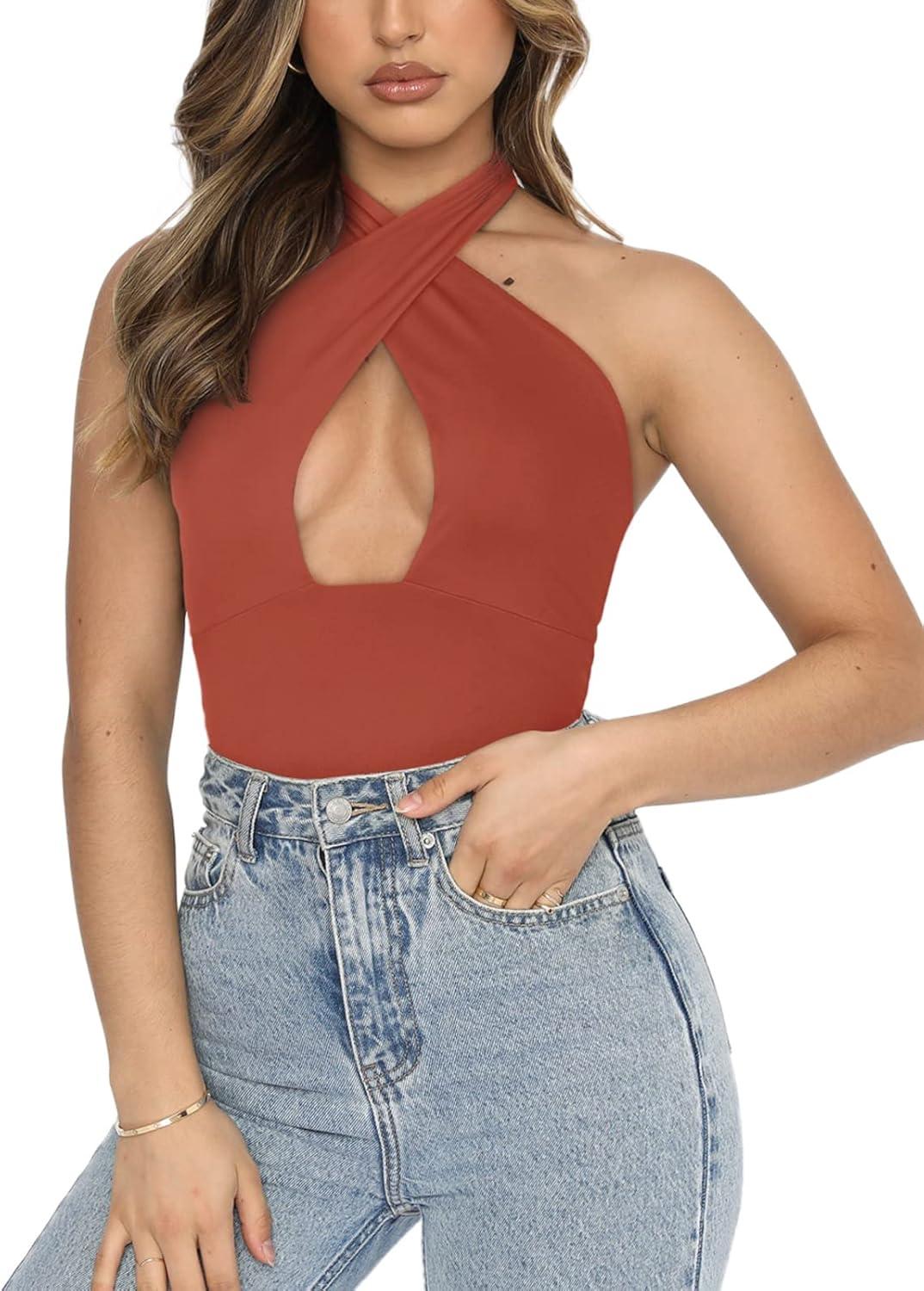 REORIA Butsmooth® Women's Trendy Sexy Casual V Neck Double Lined Sleeveless Slimming Going Out Tank Top Bodysuits(Rusty Red)