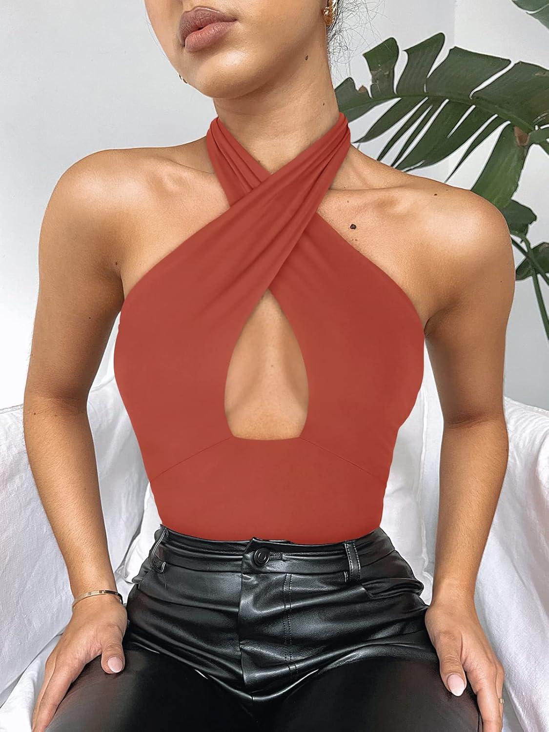 imageREORIA Butsmooth Womens Trendy Sexy Casual V Neck Double Lined Sleeveless Slimming Going Out Tank Top BodysuitsRusty Red