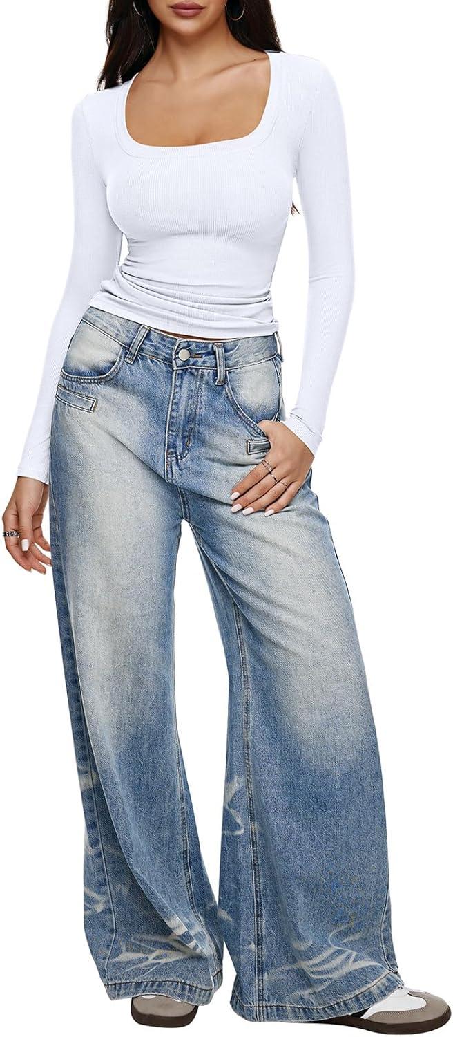 REORIA Long Sleeve Shirts for Women Scoop Neck Going Out Slim Basic Tshirts 2025 Trendy Tops Ribbed Knit Fall Outfits(White)