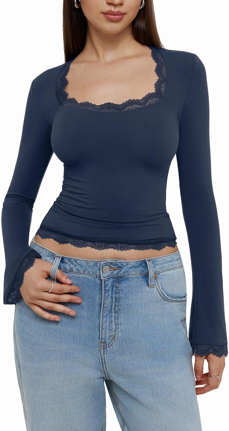 Don’t miss out on our limited-time offer: buy REORIA Womens 2025 Fall Fashion Square Neck Lace Long Bell Sleeves Shirts Double Lined Casual Slim Fit Tops(Blue), get a free {accessory}!