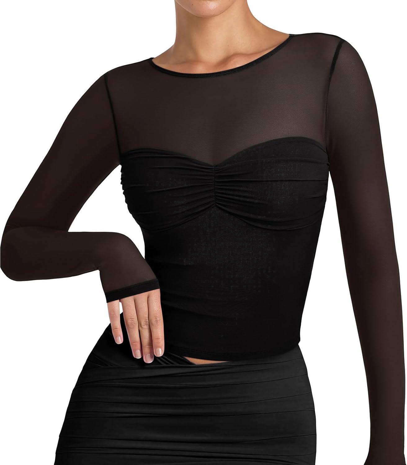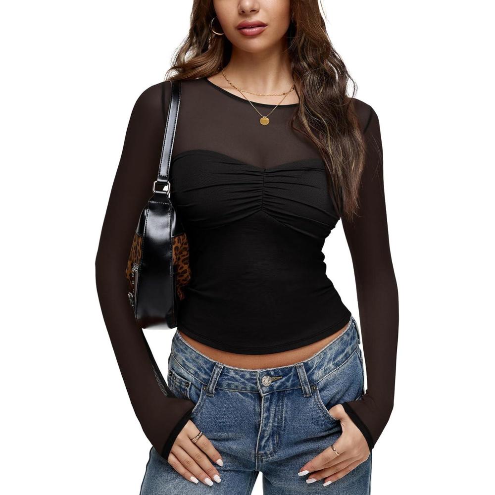 REORIA Womens 2025 Lace Long Sleeve Tops Sexy Mesh Sheer Y2k V Neck Shirts See Through Blouses(Black)