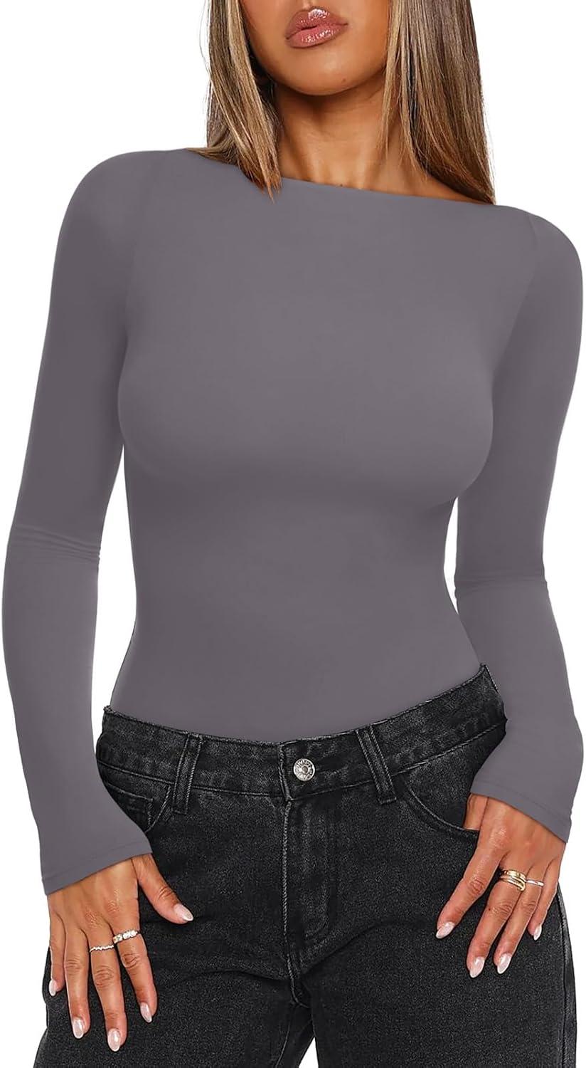 REORIA Women’s Boat Neck Long Sleeve Bodysuit Basic Going Out Body Suits Tops 2025(Deep Grey)