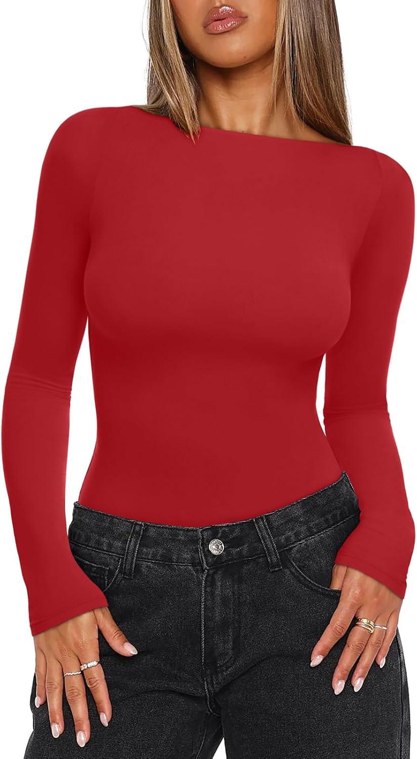 REORIA Women's Boat Neck Long Sleeve Bodysuit Basic Going Out Body Suits Tops 2025(Red)