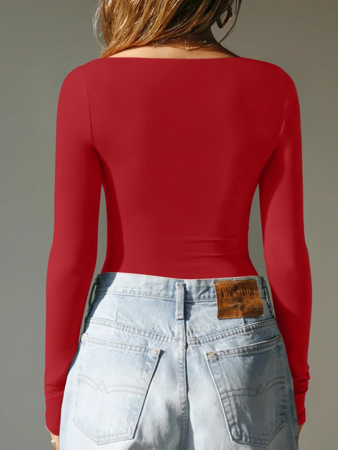 REORIA Women’s Boat Neck Long Sleeve Bodysuit Basic Going Out Body Suits Tops 2025(Red)