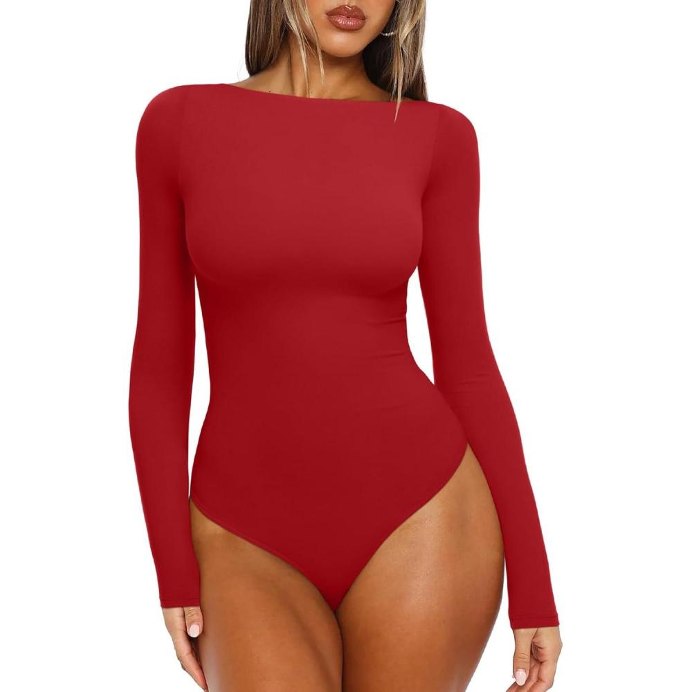 imageREORIA Womens Boat Neck Long Sleeve Bodysuit Basic Going Out Body Suits Tops 2025Red