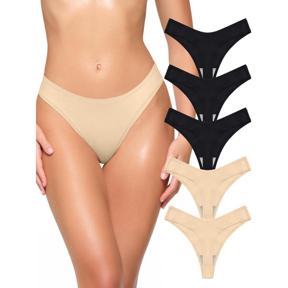 REORIA Womens Cotton Seamless Thongs Panties for Women No Show Breathable Underwear 5 Pack(Black 3 Sand 2 Pack)