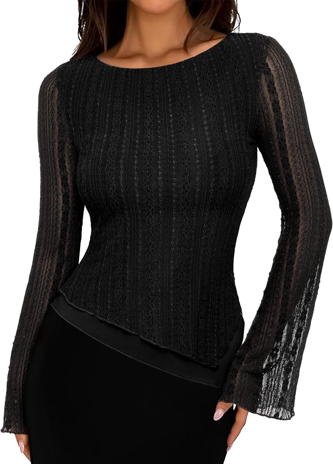 REORIA Women’s Lace Mesh Boat Neck Bell Long Sleeve Tops Y2k Going Out Asymmetrical Tops 2025 Fall Fashion(Black Onyx)