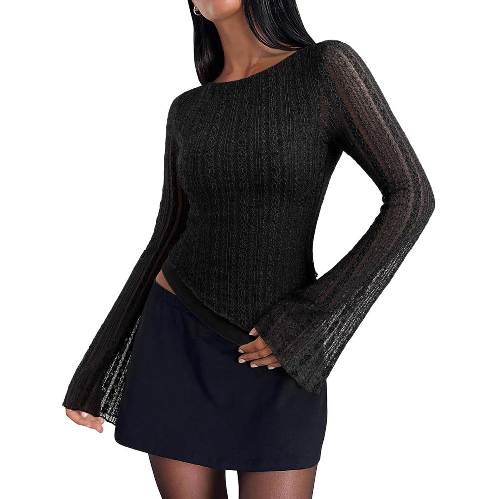 REORIA Women's Lace Mesh Boat Neck Bell Long Sleeve Tops Y2k Going Out Asymmetrical Tops 2025 Fall Fashion(Black Onyx)