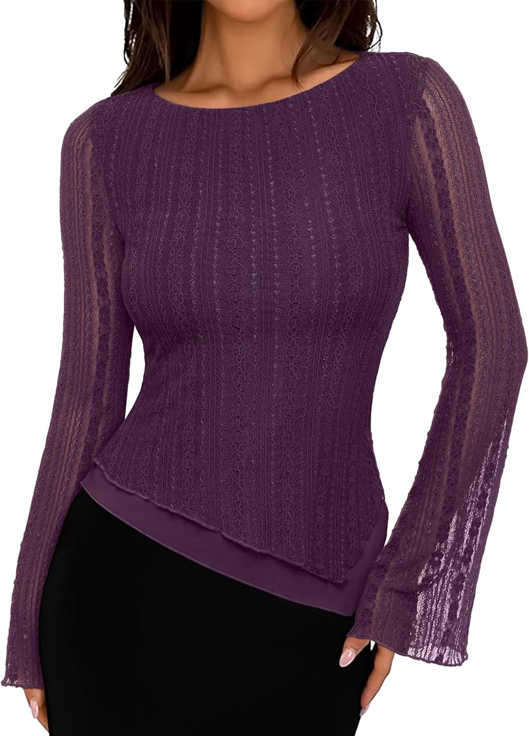 REORIA Women’s Lace Mesh Boat Neck Bell Long Sleeve Tops Y2k Going Out Asymmetrical Tops 2025 Fall Fashion(Crushed Violets)