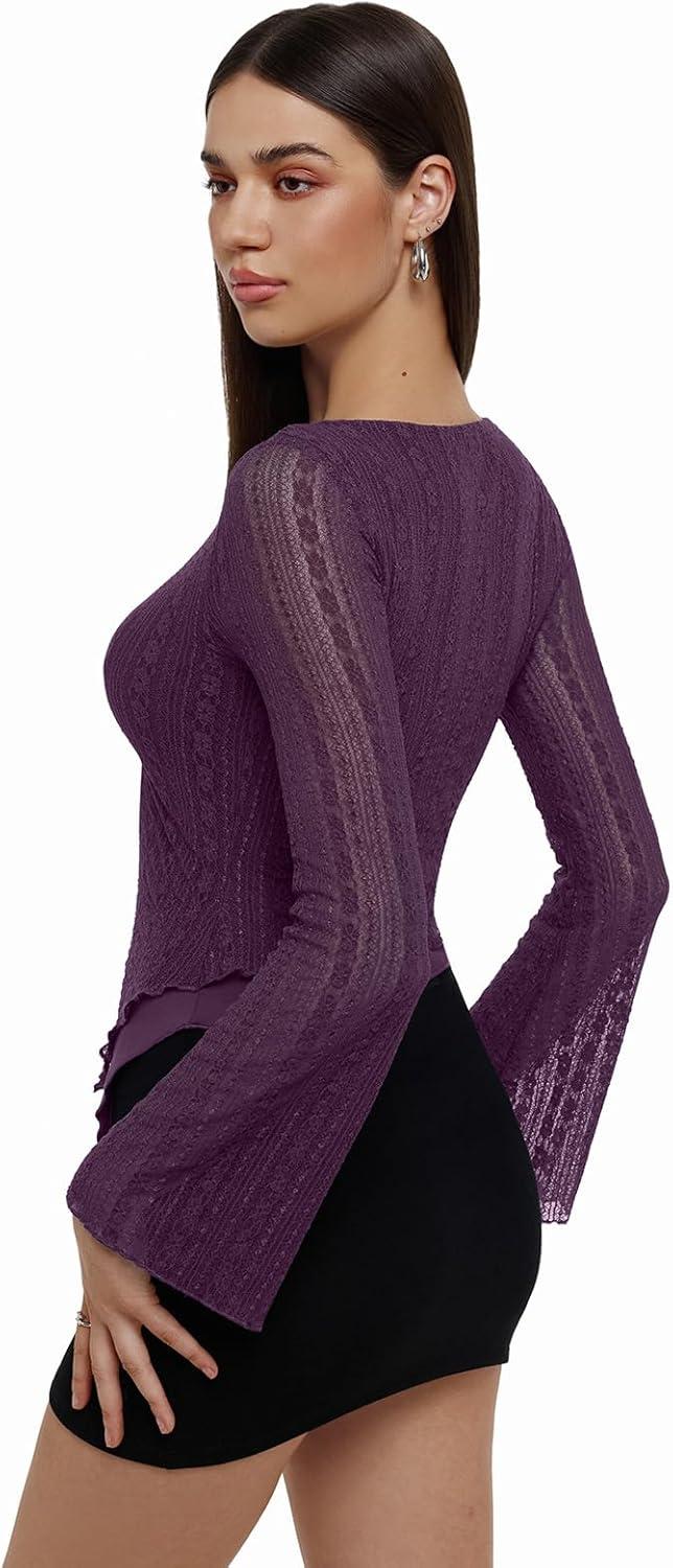 REORIA Women's Lace Mesh Boat Neck Bell Long Sleeve Tops Y2k Going Out Asymmetrical Tops 2025 Fall Fashion(Crushed Violets)