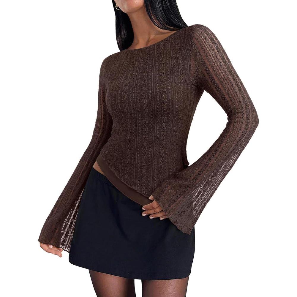REORIA Women's Lace Mesh Boat Neck Bell Long Sleeve Tops Y2k Going Out Asymmetrical Tops 2025 Fall Fashion(Shaved Chocolate)