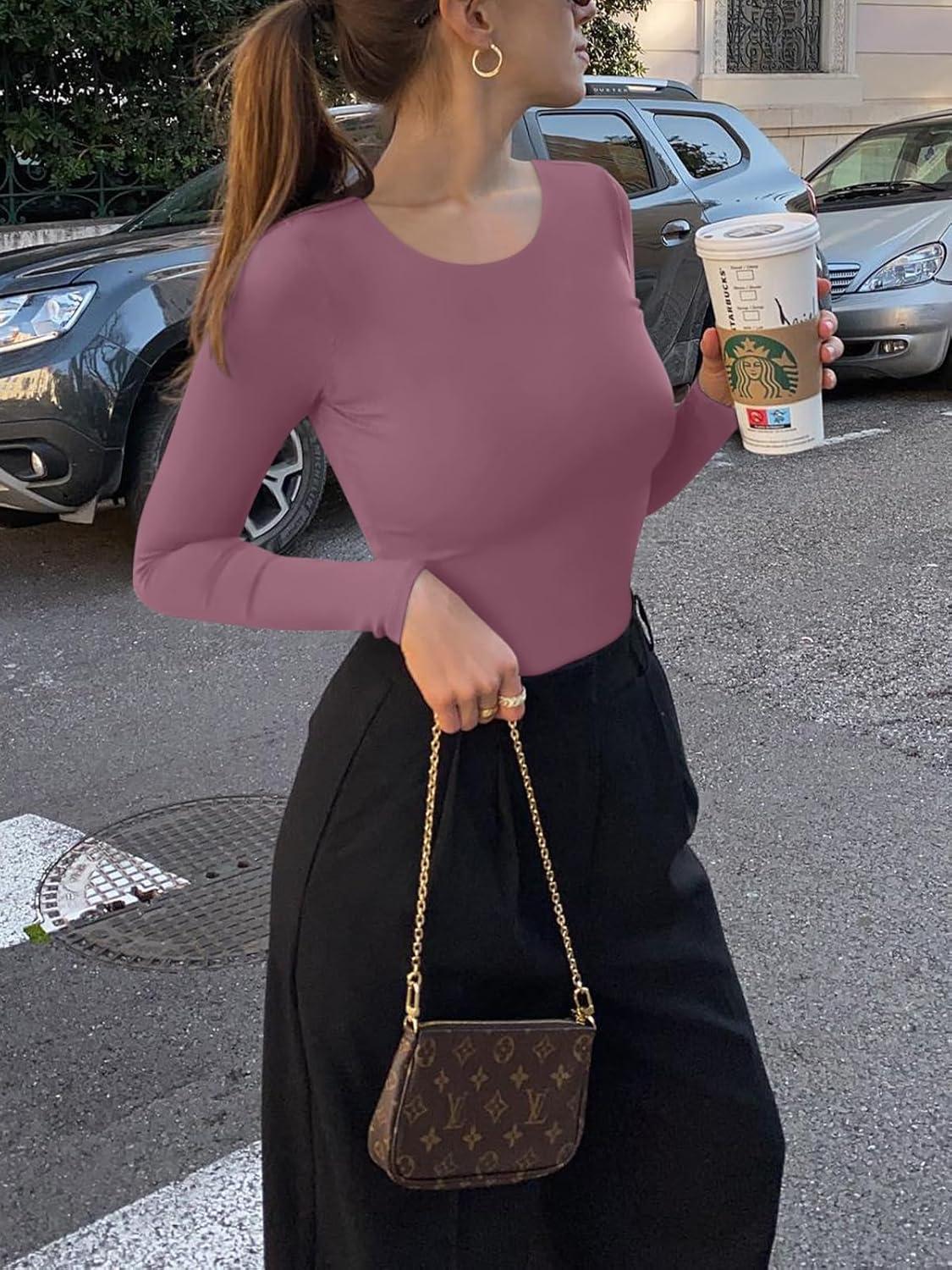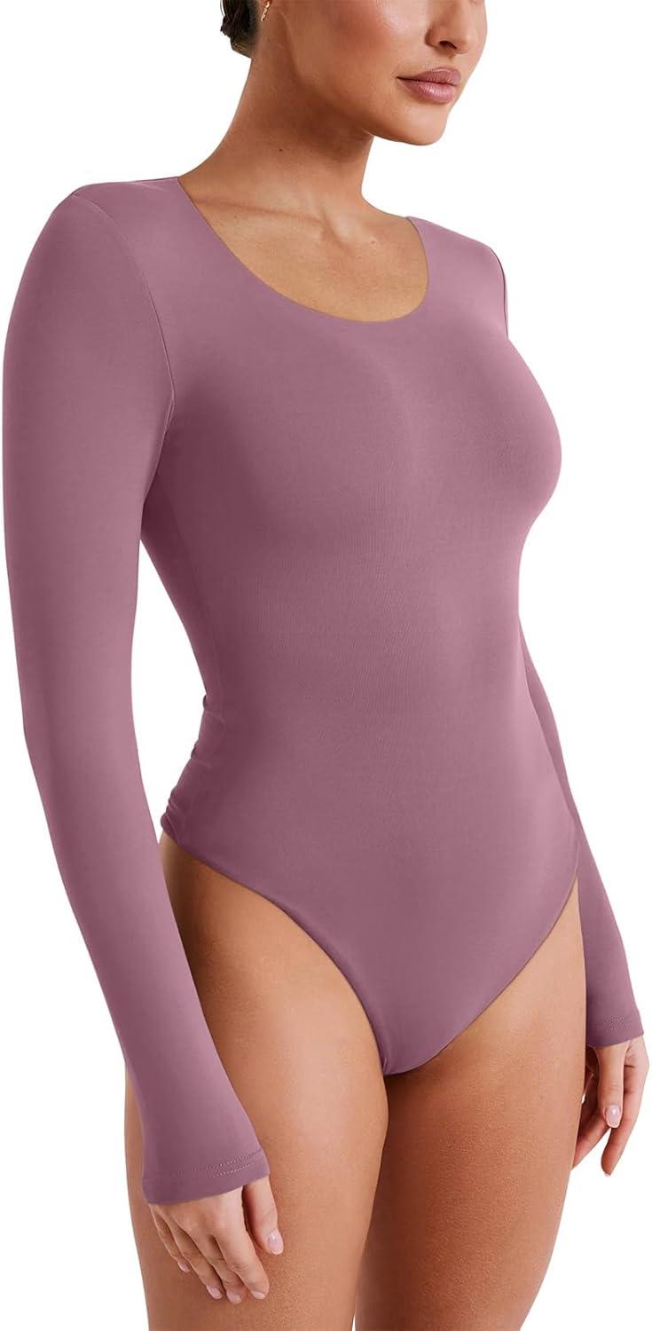 imageREORIA Womens Long Sleeve Bodysuits Fall Basic Round Neck Lightweight Double Lined Layering Slim Body Suit TopsMarsala