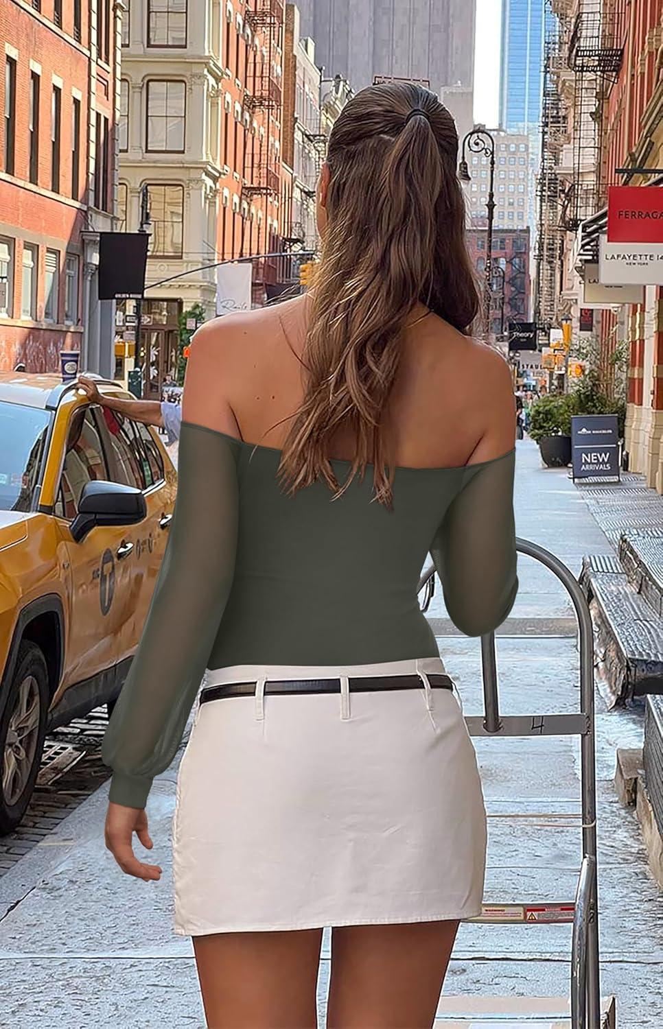 imageREORIA Womens Off The Shoulder Sheer Mesh Puff Long Sleeve Thong Bodysuit TopsGarden Green