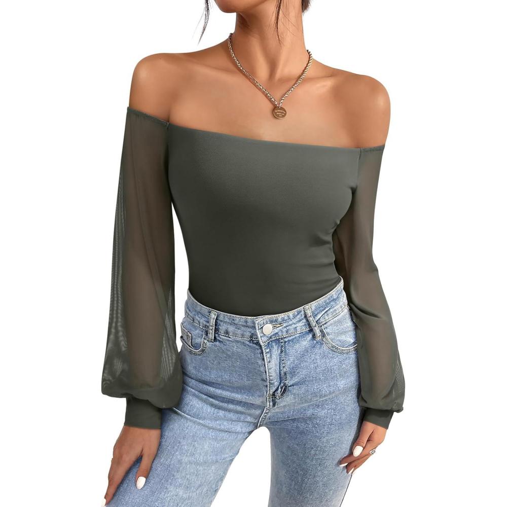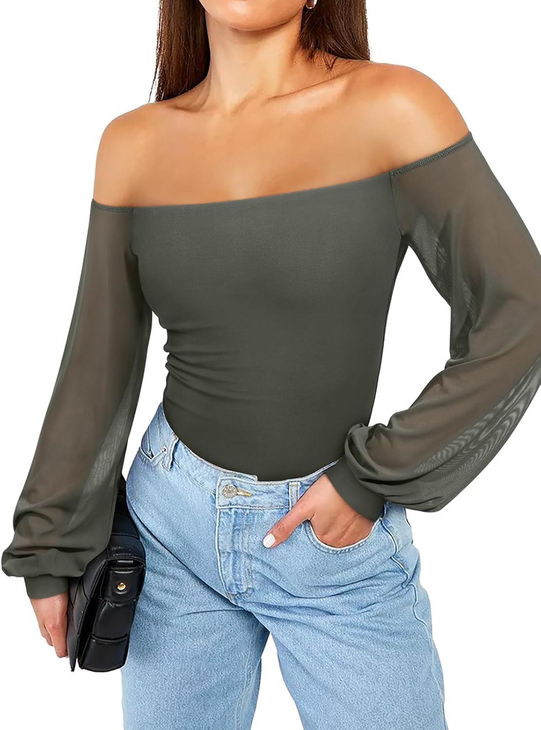 REORIA Womens Off The Shoulder Sheer Mesh Puff Long Sleeve Thong Bodysuit Tops(Garden Green)