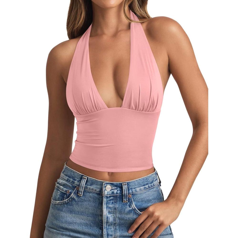 REORIA Women's Plunge Neck Backless Shirts Double Lined Halter Tank Tops Y2k Cute Summer Trendy Sleeveless Crop Tops(Pink)