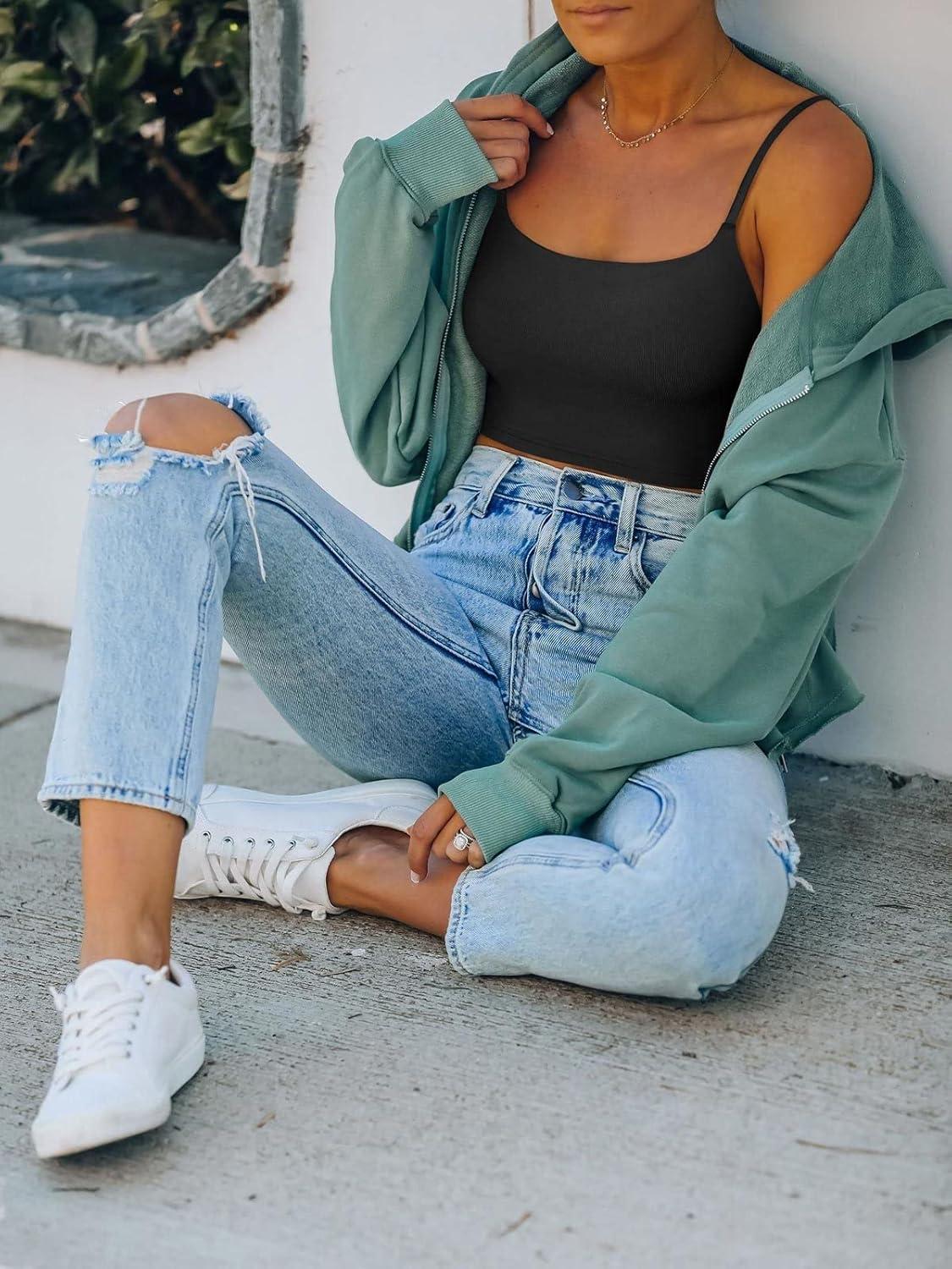 imageREORIA Womens Sexy Adjustable Spaghetti Strap Double Lined Seamless Camisole Tank Yoga Crop TopsBlack