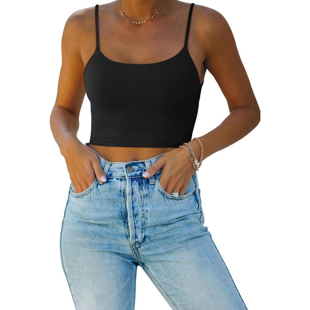 REORIA Women’s Sexy Adjustable Spaghetti Strap Double Lined Seamless Camisole Tank Yoga Crop Tops(Black)