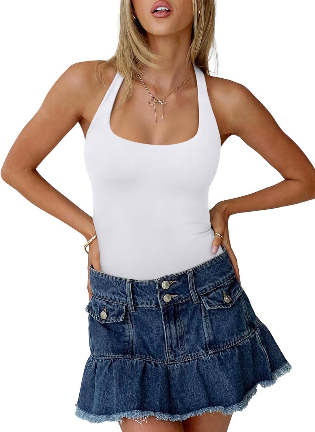 REORIA Women's Sexy Deep Scoop Neck Halter Bodysuit Double Lined Sleeveless Backless Top Vacation Outfits(White)