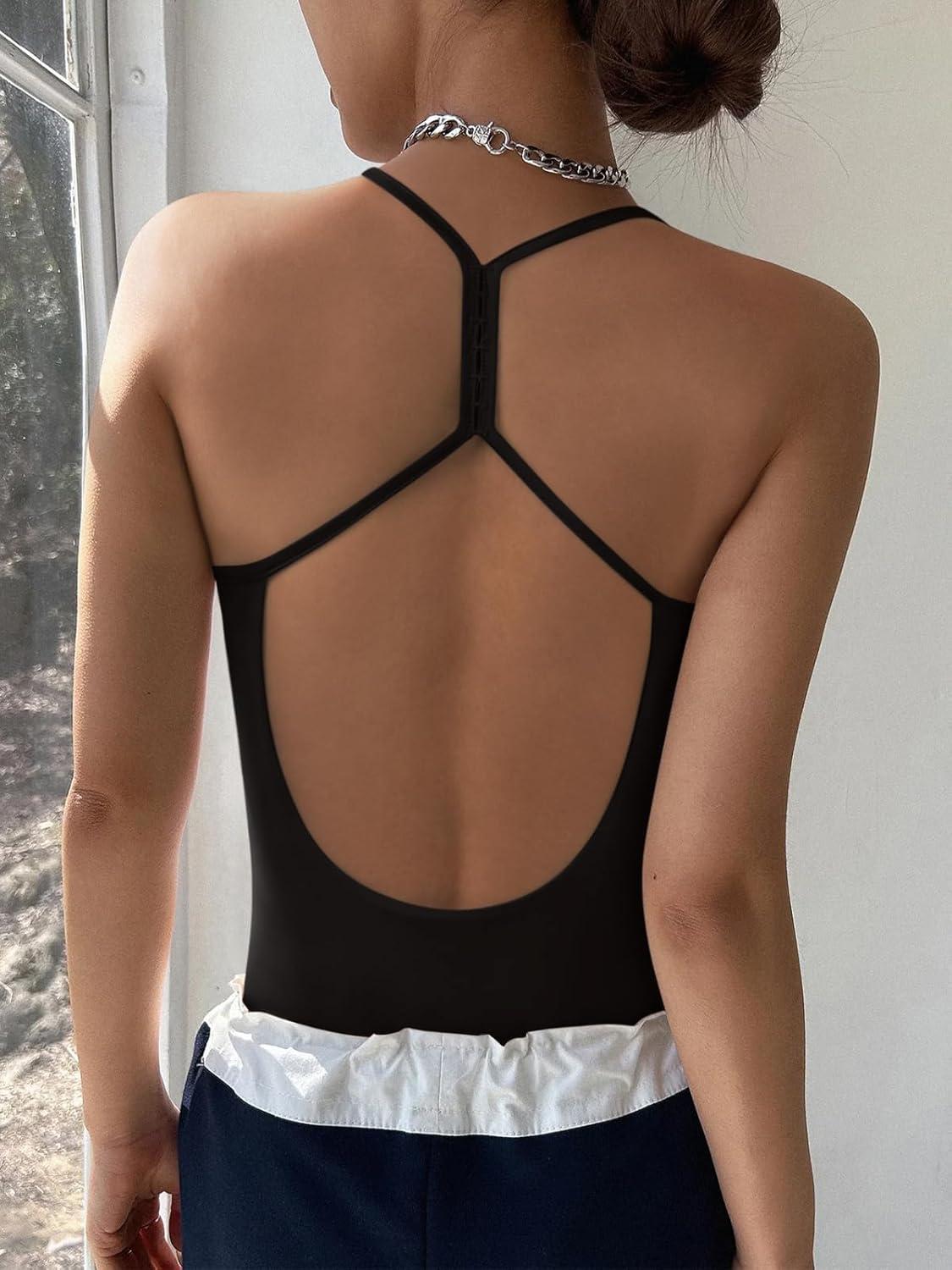 REORIA Women's Sexy Scoop Neck Backless Bodysuits Open T-Back Cami Sleeveless Bodysuit Tank Top Trendy(Black)