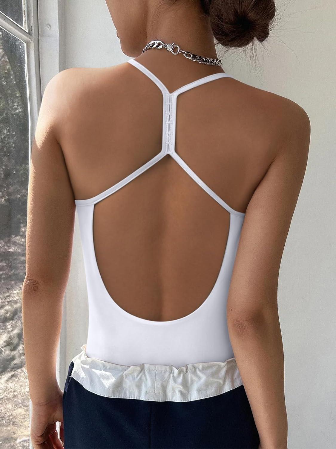 REORIA Women's Sexy Scoop Neck Backless Bodysuits Open T-Back Cami Sleeveless Bodysuit Tank Top Trendy(White)