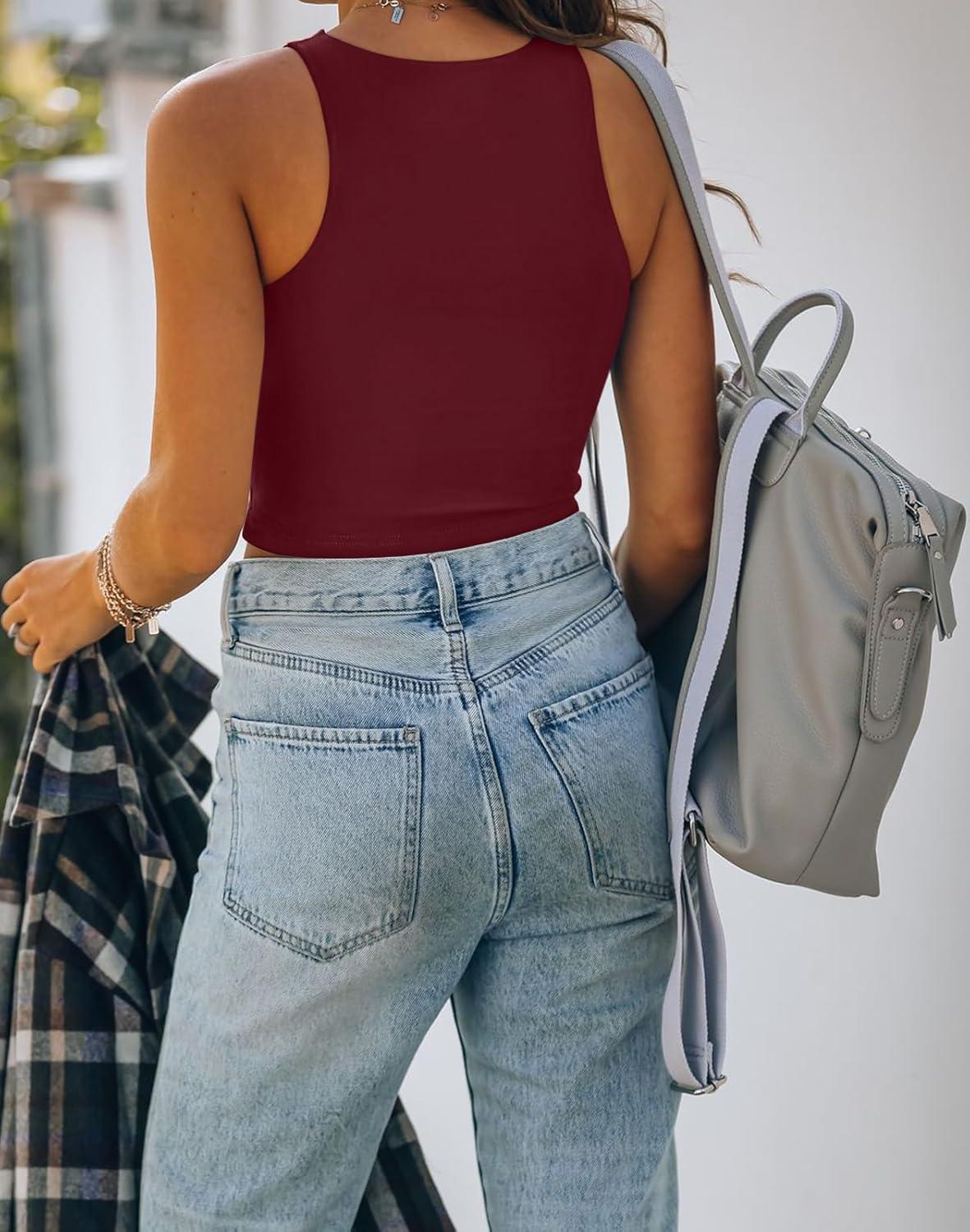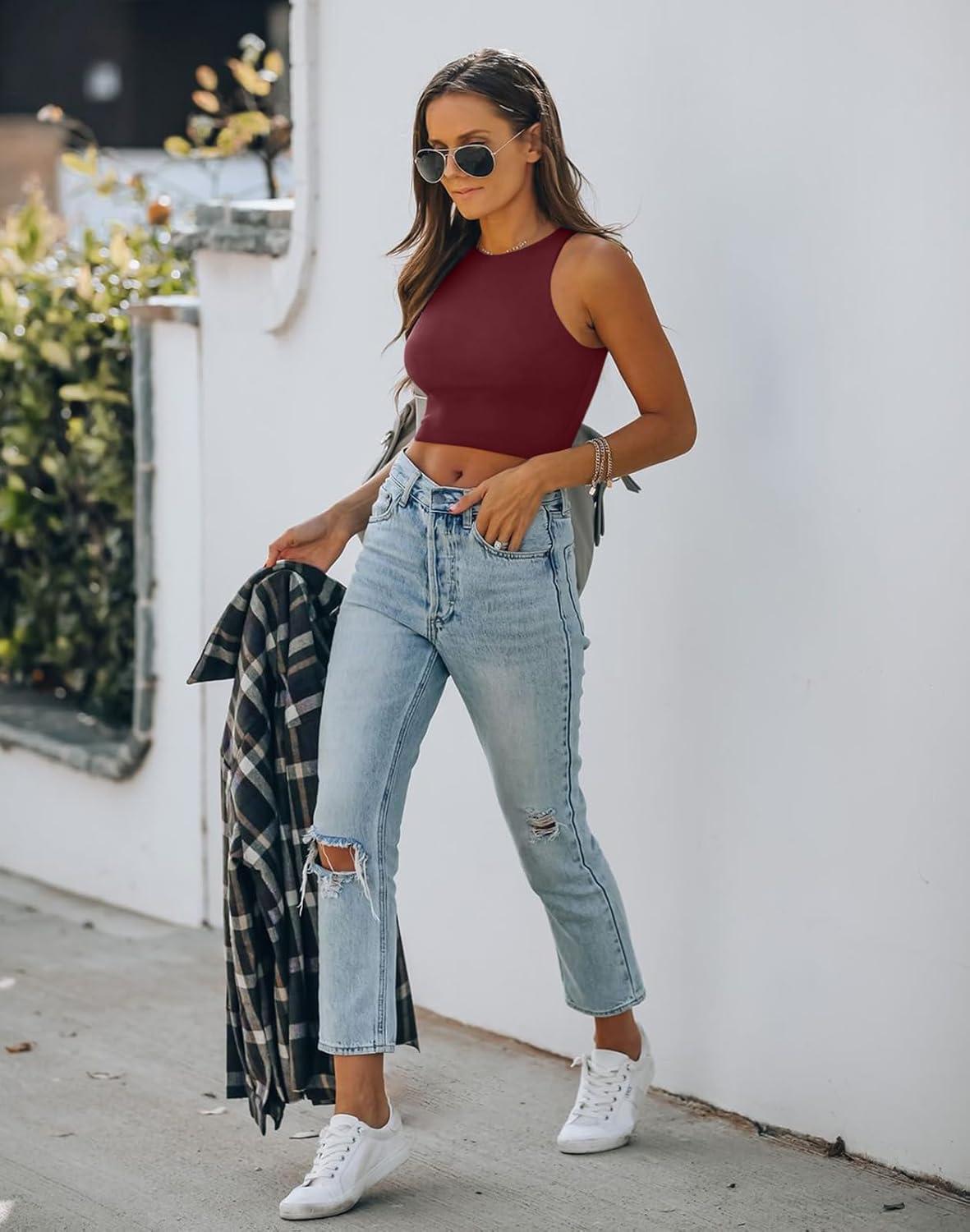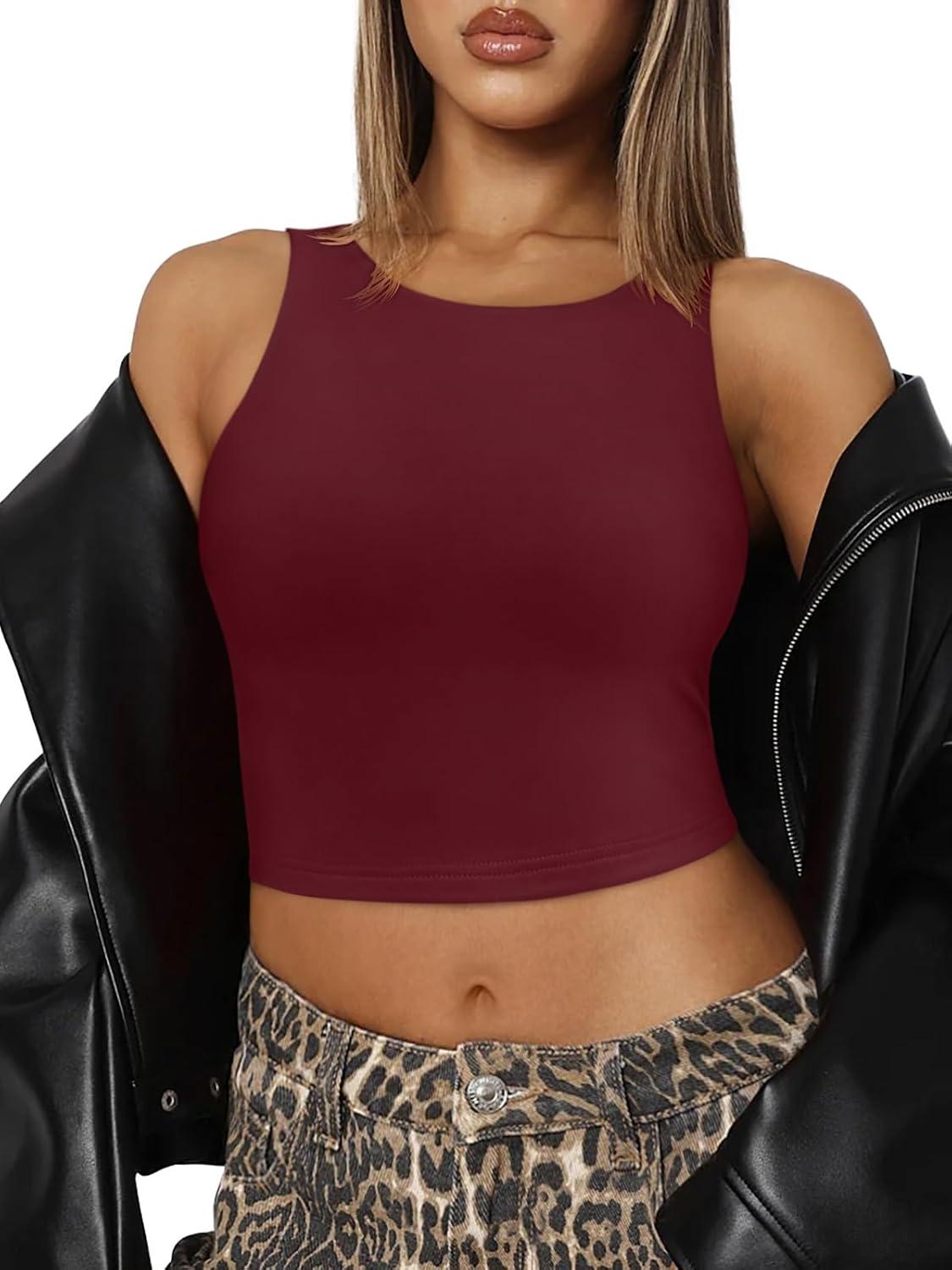 REORIA Women’s Sexy Sleeveless Racer Back Tank Tops Halter Neck Crop Tops(Burgundy)