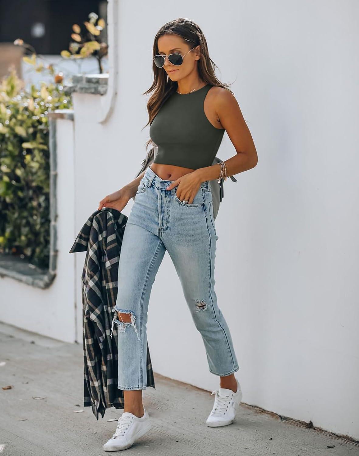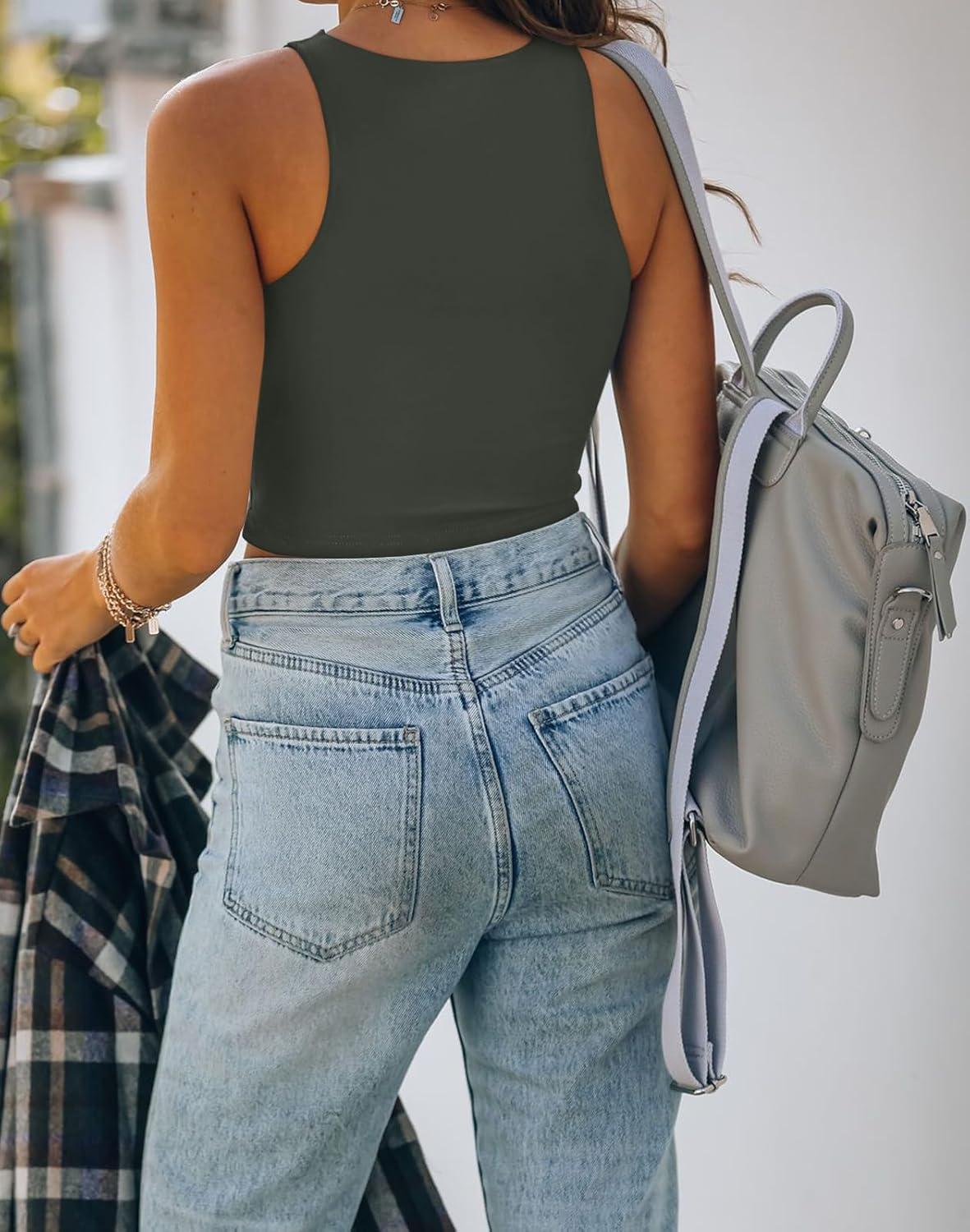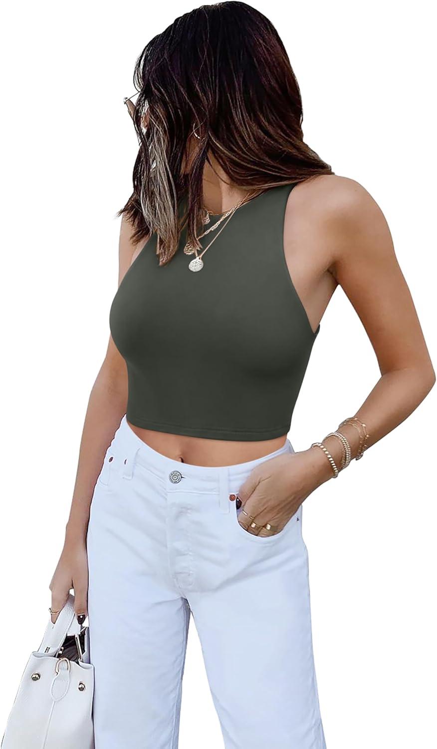 REORIA Women’s Sexy Sleeveless Racer Back Tank Tops Halter Neck Crop Tops(Green Grey)