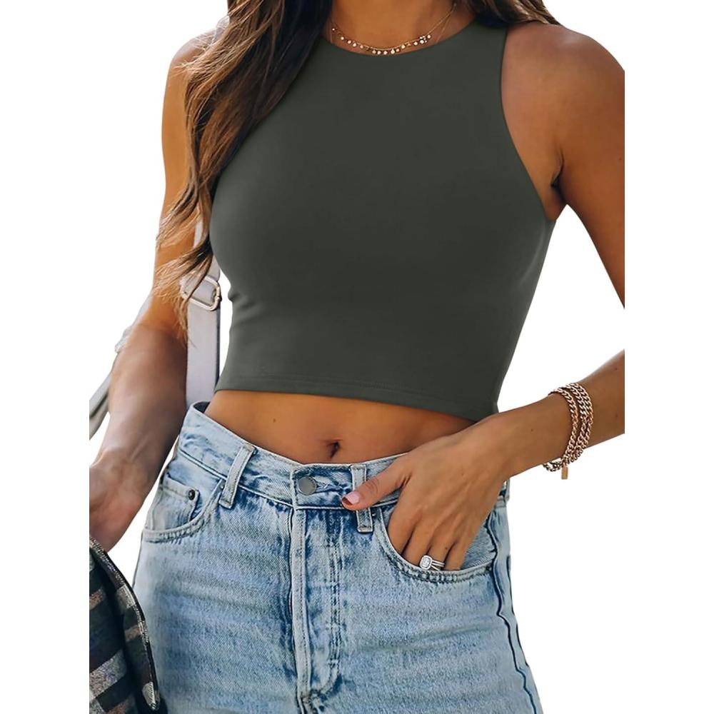 imageREORIA Womens Sexy Sleeveless Racer Back Tank Tops Halter Neck Crop TopsGreen Grey