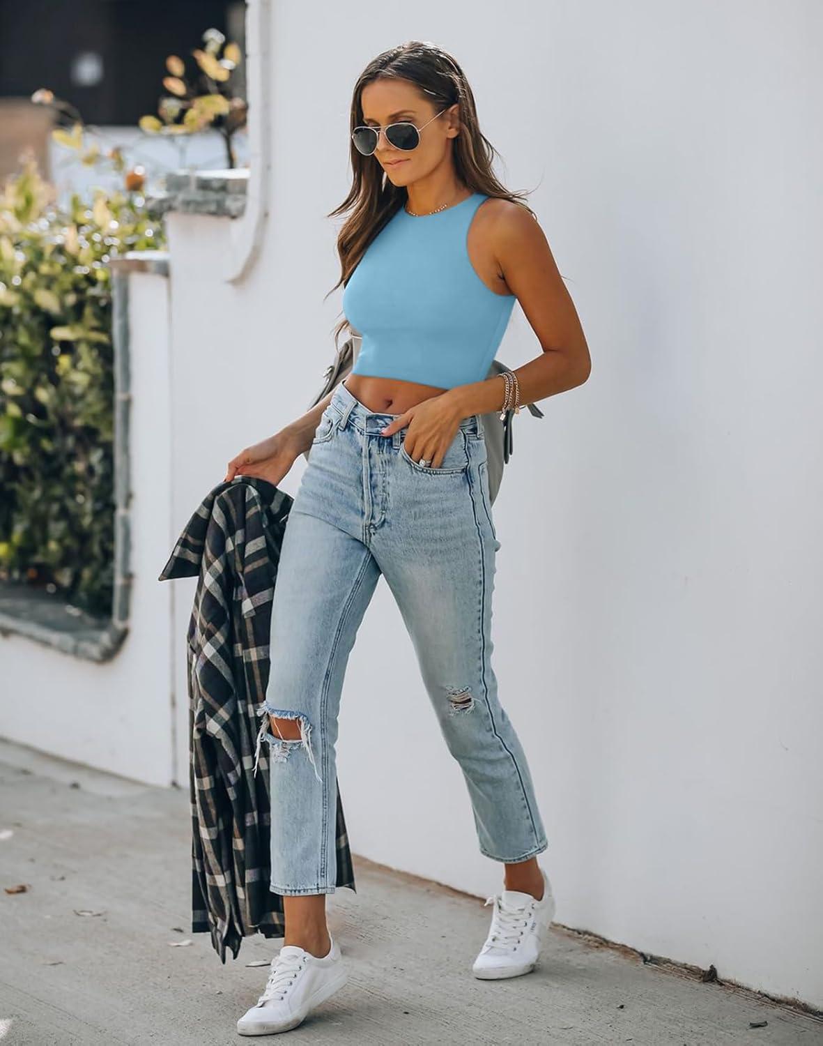 REORIA Women’s Sexy Sleeveless Racer Back Tank Tops Halter Neck Crop Tops(Sky Blue)