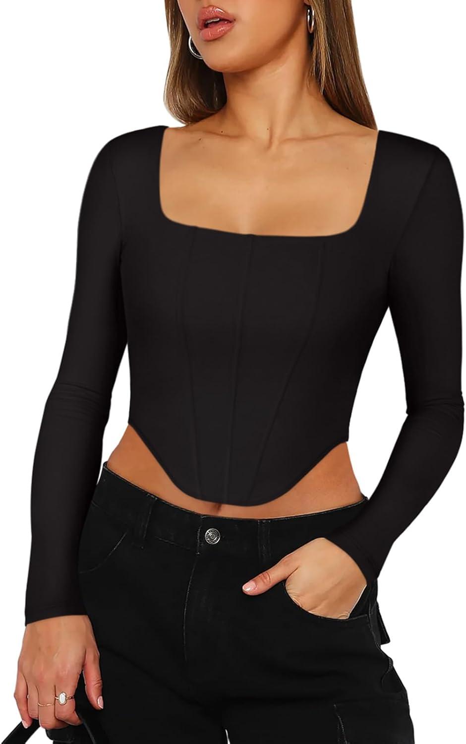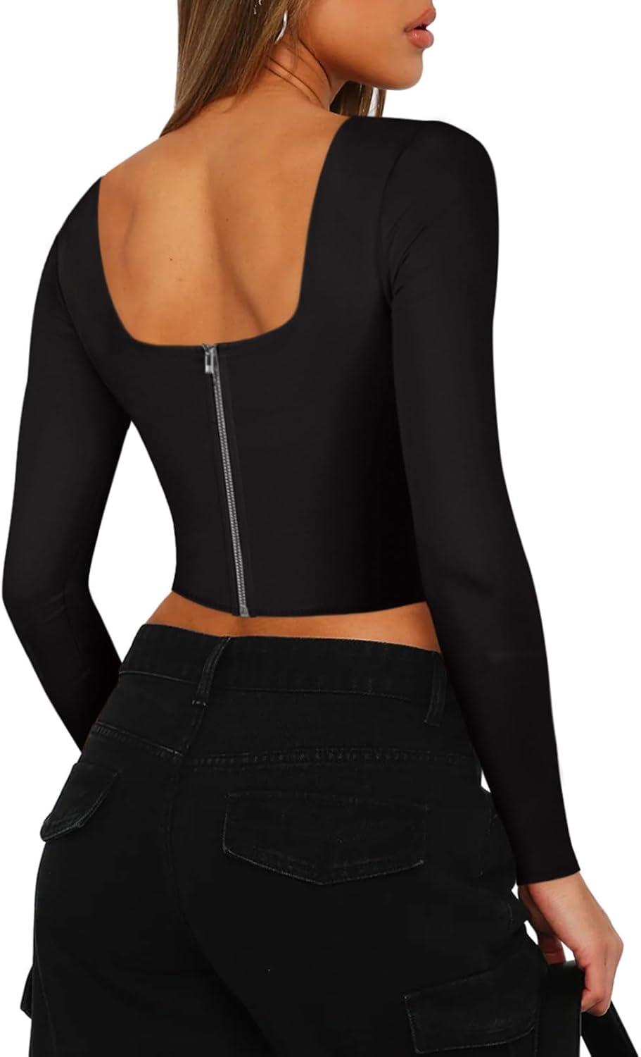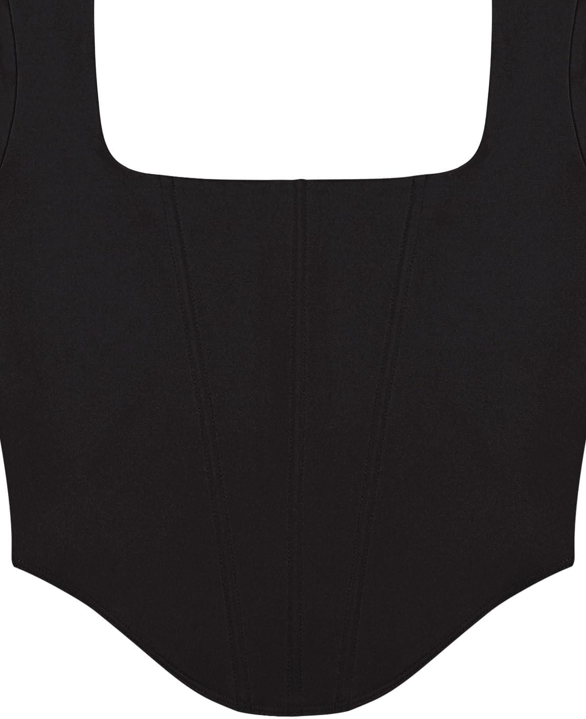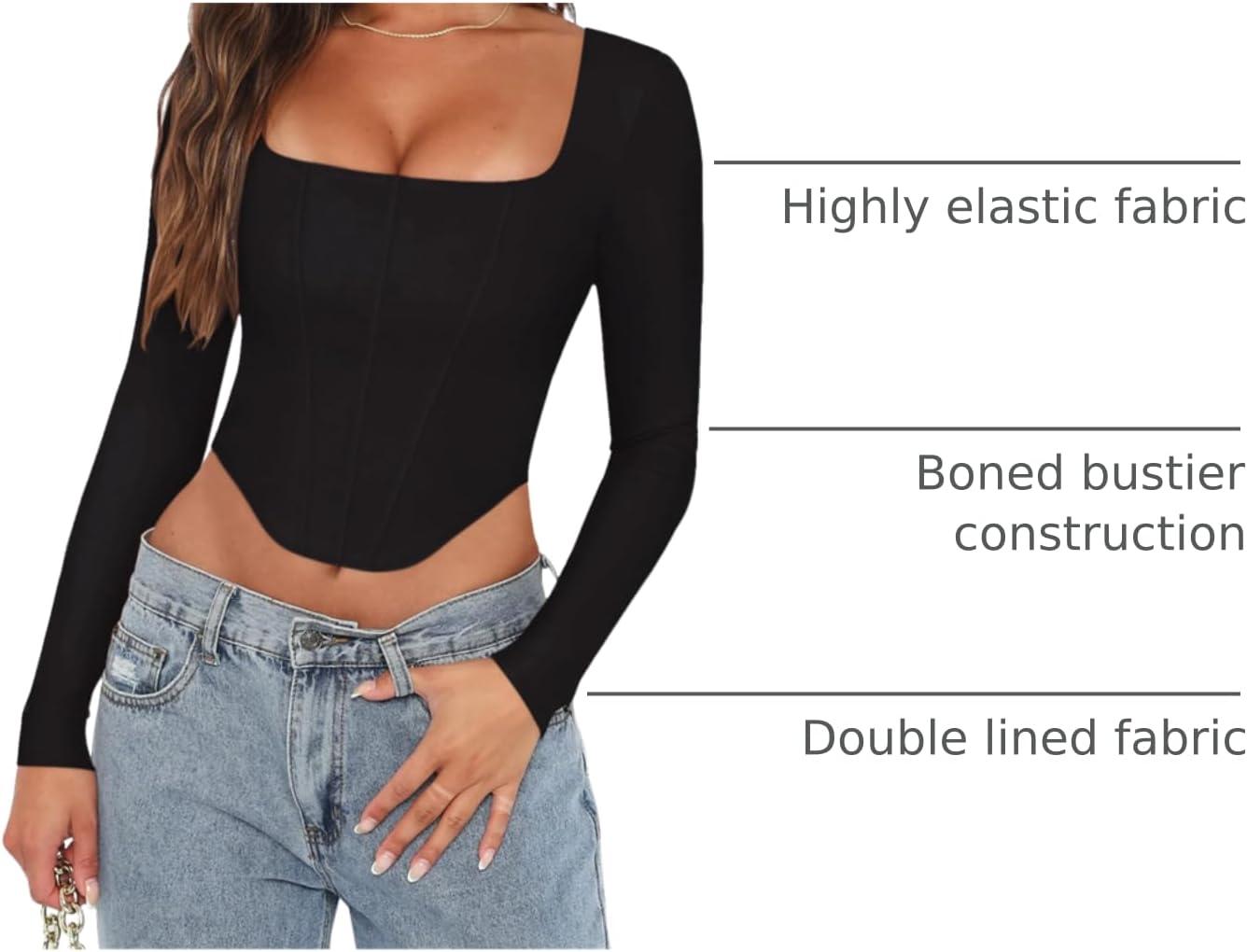 REORIA Womens Sexy Square Neck Long Sleeve Backless Going Out Boned Bustier Corset Crop Tops(Black)