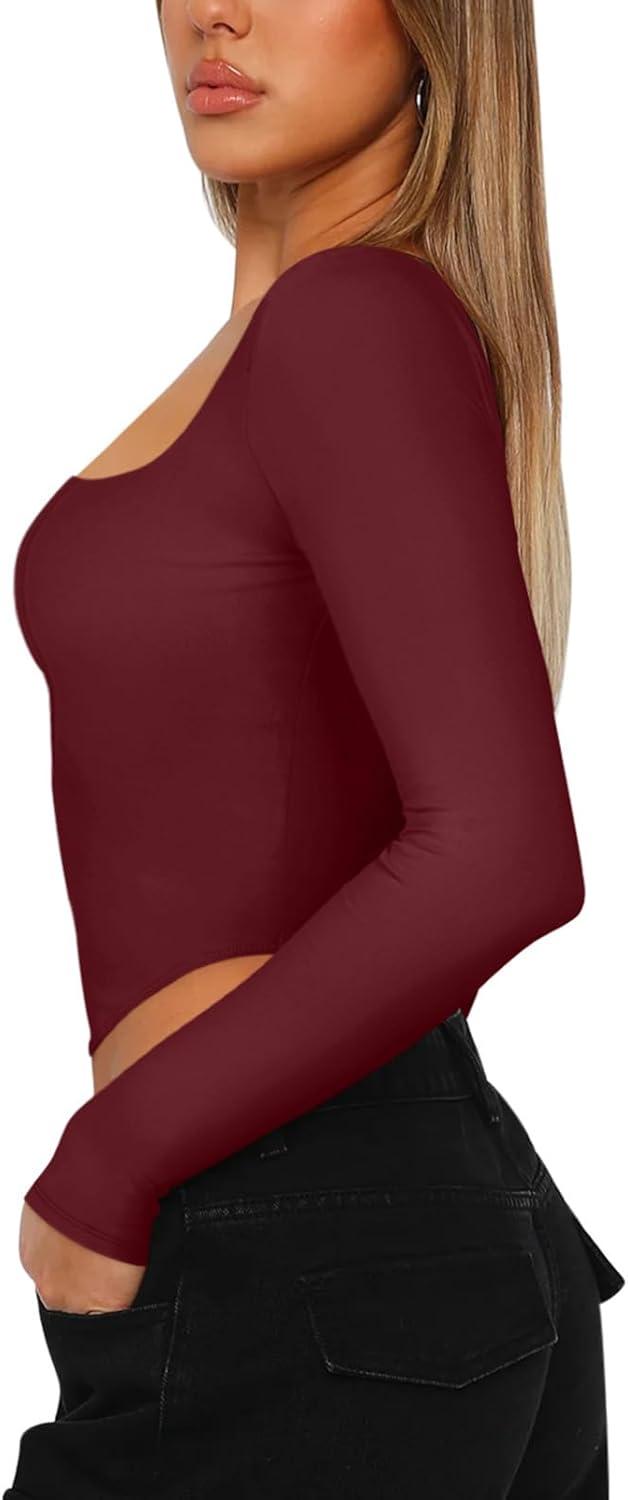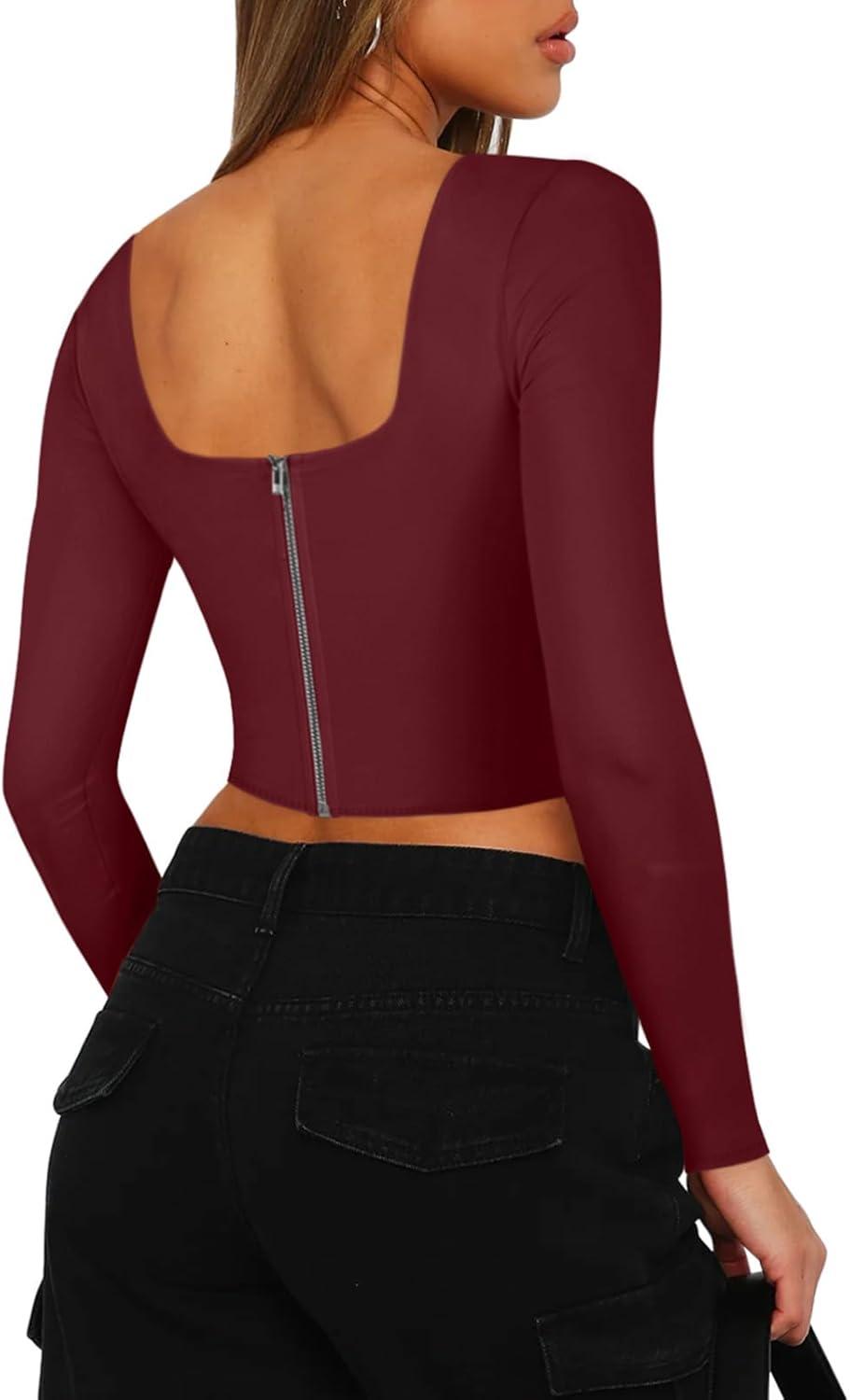REORIA Womens Sexy Square Neck Long Sleeve Backless Going Out Boned Bustier Corset Crop Tops(Burgundy)