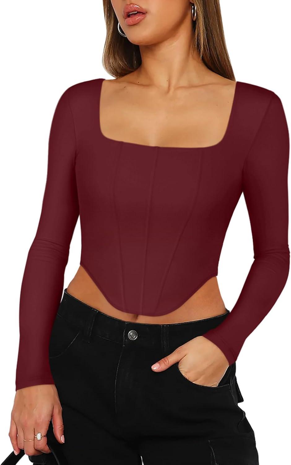 imageREORIA Womens Sexy Square Neck Long Sleeve Backless Going Out Boned Bustier Corset Crop TopsBurgundy