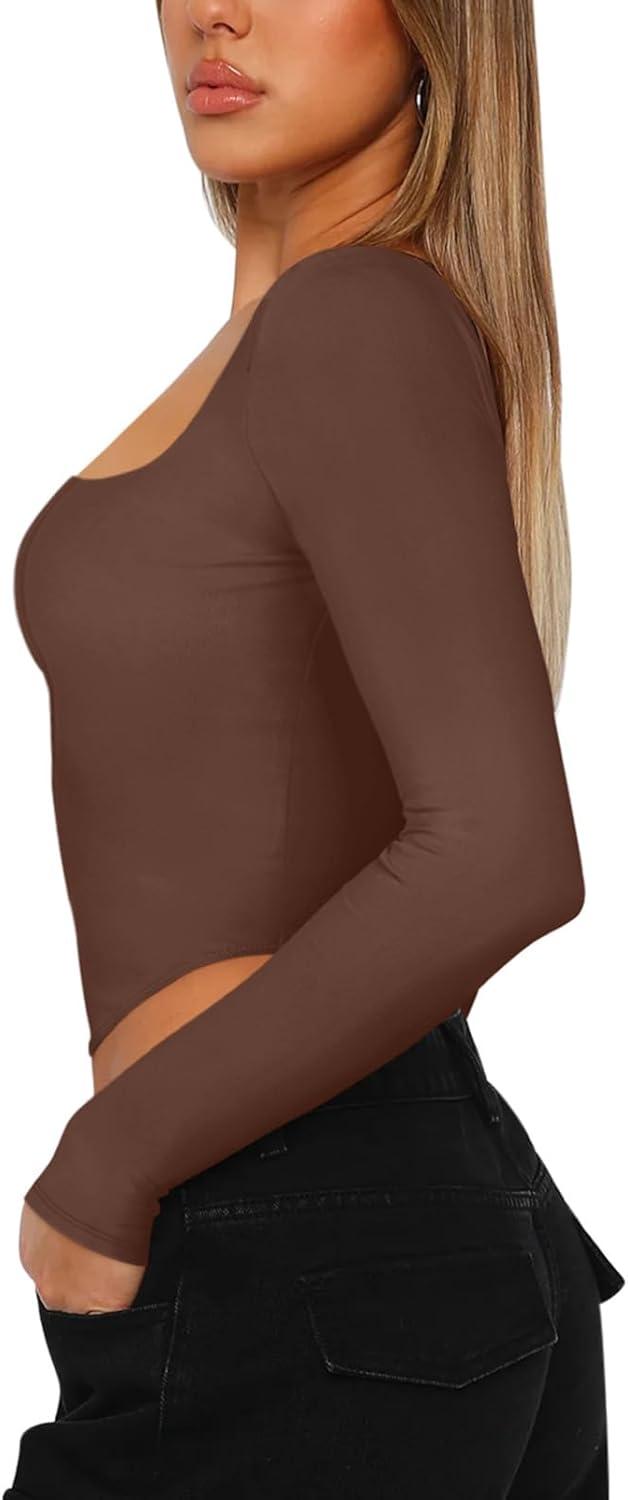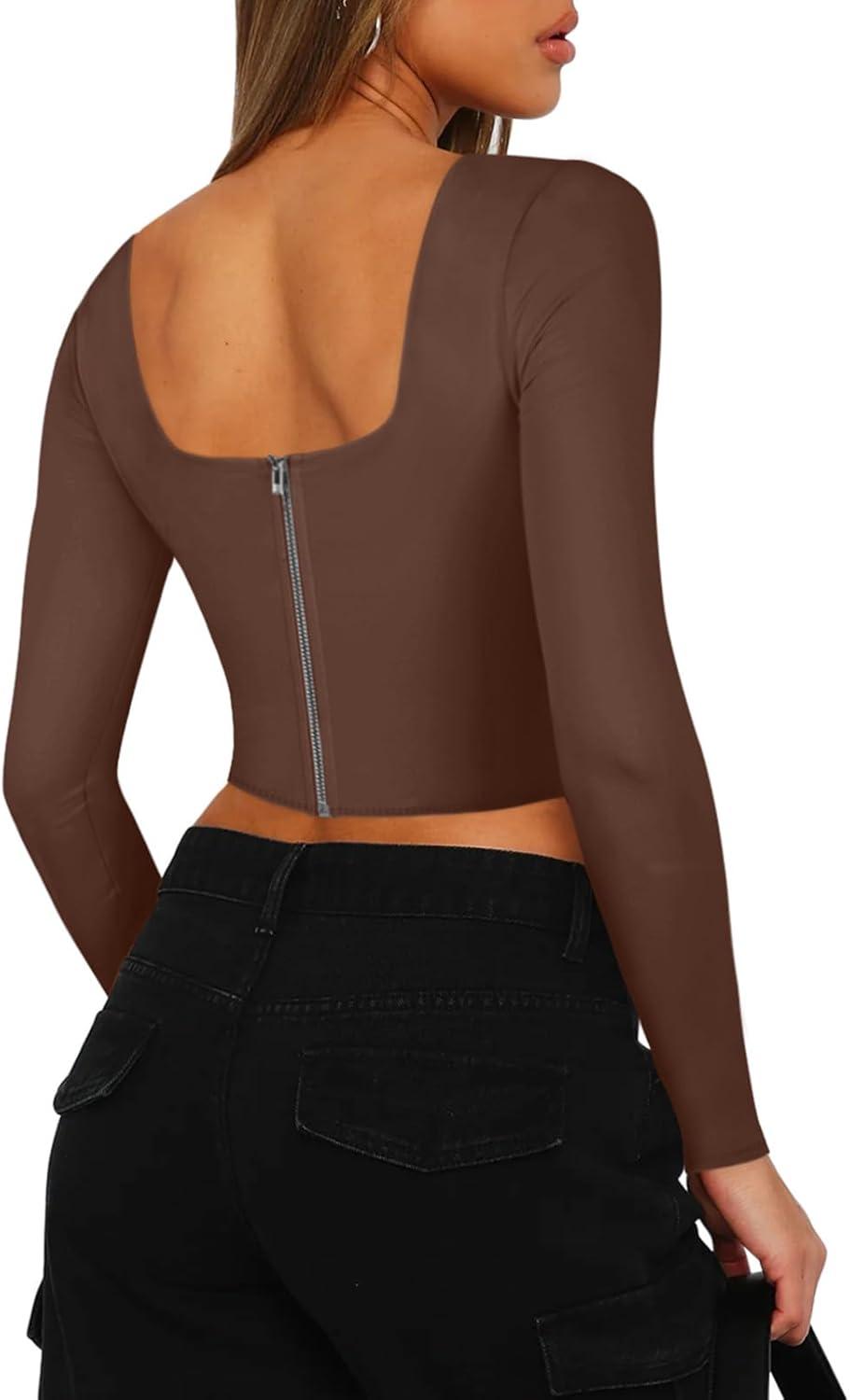 REORIA Womens Sexy Square Neck Long Sleeve Backless Going Out Boned Bustier Corset Crop Tops(Coffee)