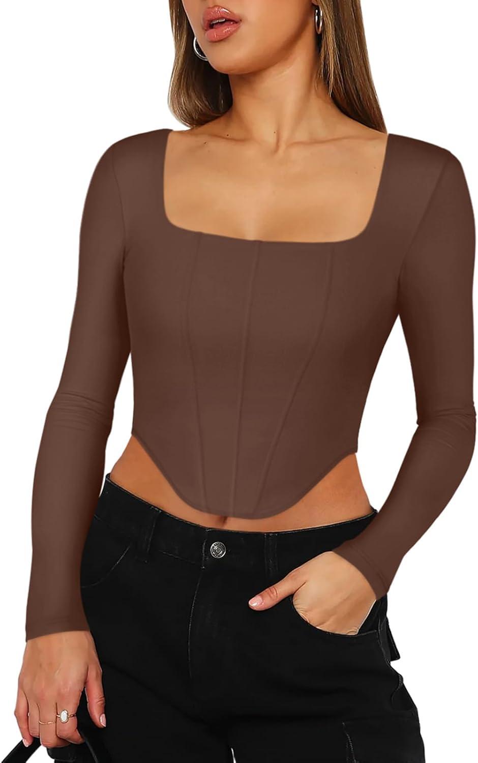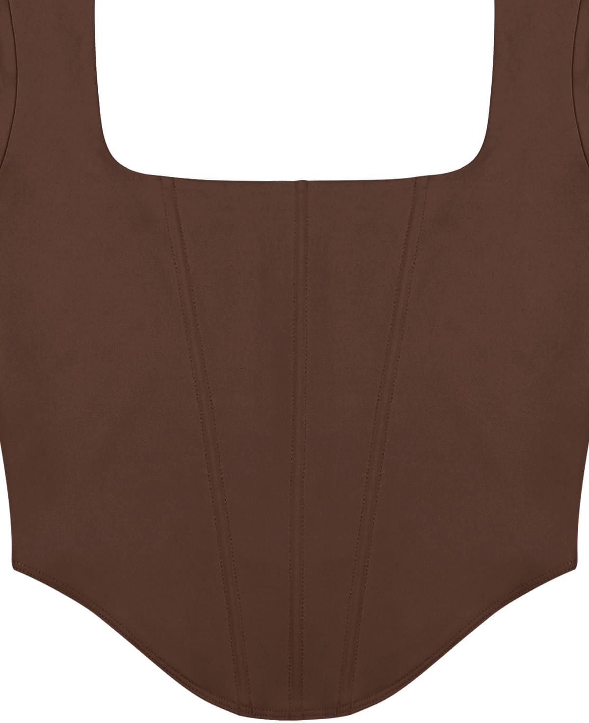 imageREORIA Womens Sexy Square Neck Long Sleeve Backless Going Out Boned Bustier Corset Crop TopsCoffee