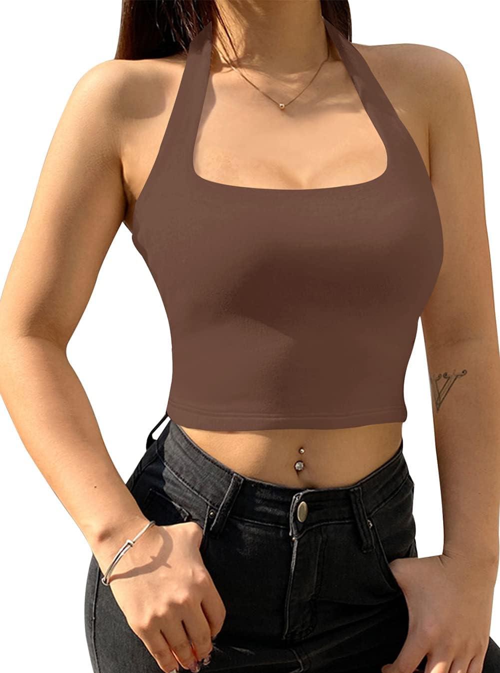 REORIA Women’s Trendy Sexy Halter Neck Backless Seamless Sleeveless Y2K Cropped Tank Yoga Crop Tops(Coffee)