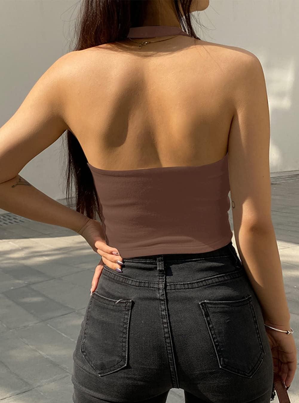 REORIA Women's Trendy Sexy Halter Neck Backless Seamless Sleeveless Y2K Cropped Tank Yoga Crop Tops(Coffee)