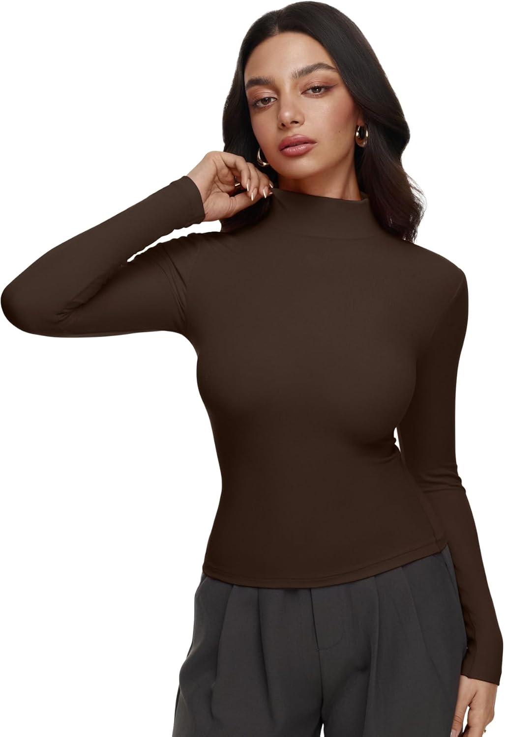 REORIA Women’s Turtleneck Tops Slim Basic Mock Neck Long Sleeve Shirts 2025 Fall Winter Layering Outfits(Coffee)