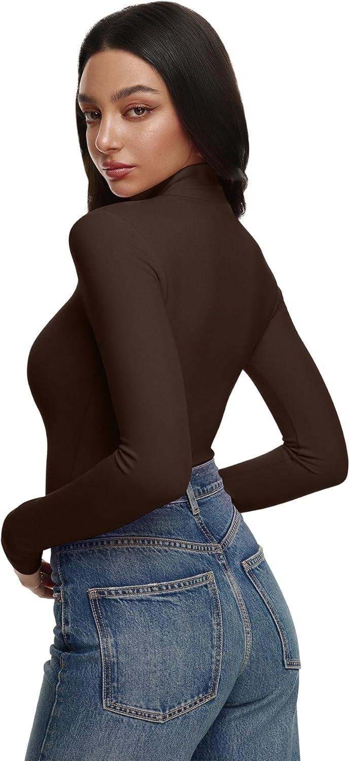 imageREORIA Womens Turtleneck Tops Slim Basic Mock Neck Long Sleeve Shirts 2025 Fall Winter Layering OutfitsCoffee