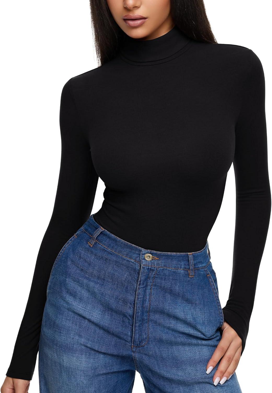 REORIA Womens Wool Blend Turtleneck Long Sleeve Basic Bodysuit Tops Fall Clothes(Black Onyx)